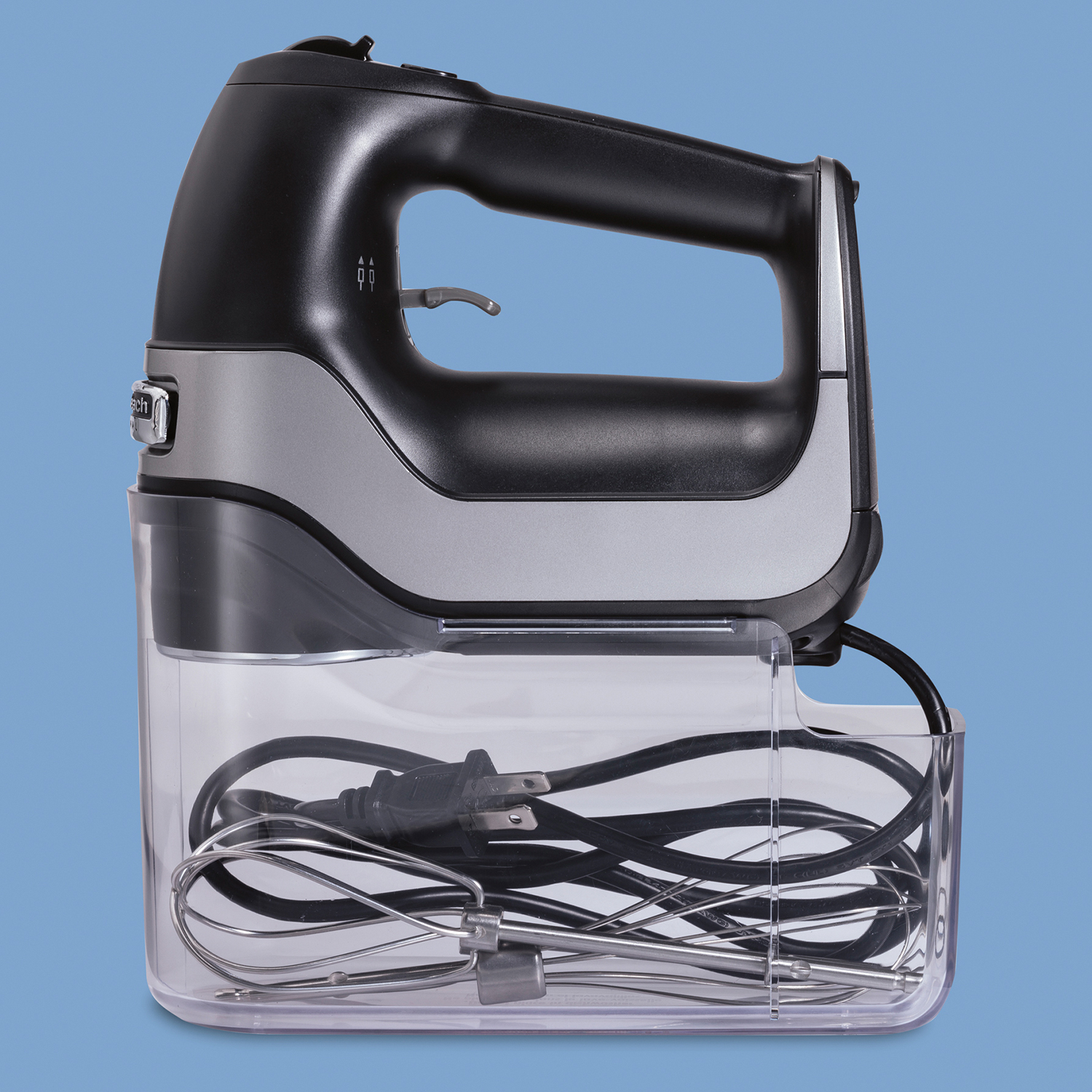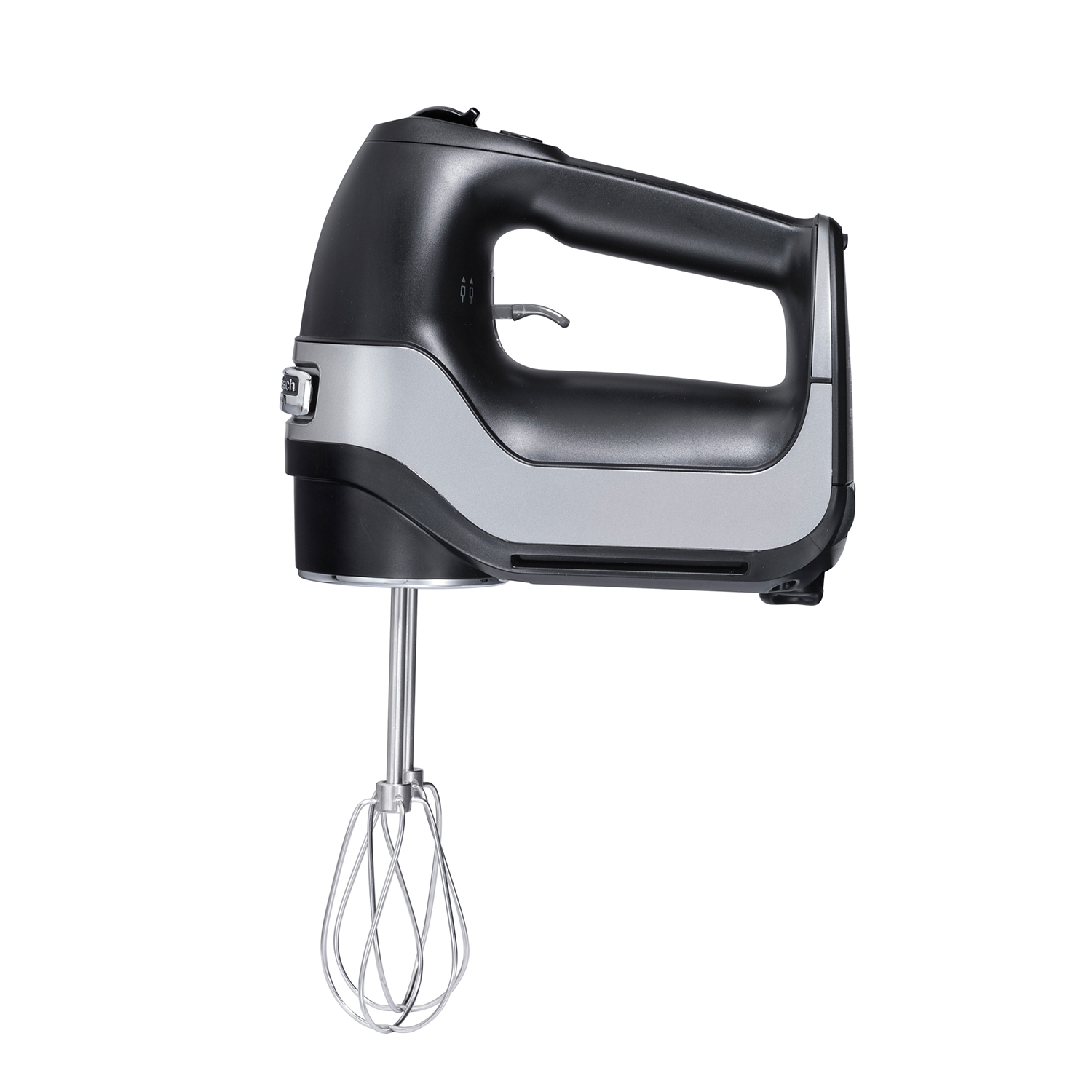 Incluye estuche de almacenamiento a presión con batidores, batidor y cable giratorio bloqueable para uso con la mano derecha o izquierda. Así mismo, cuenta con práctico gatillo para desmontar los batidores.