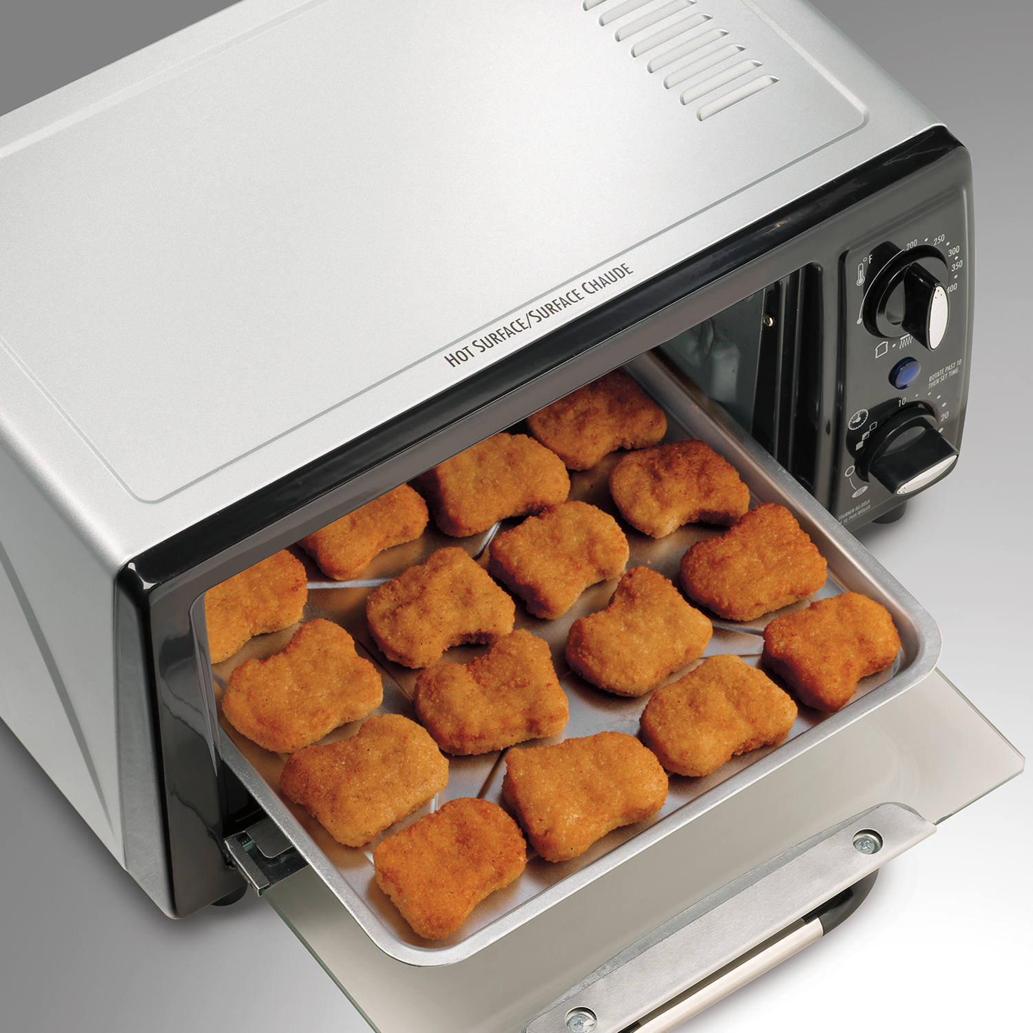 • Usa hasta 80% menos energía y es 28% más rápido que un horno de cocina típico al recalentar nuggets de pollo precocidos congelados