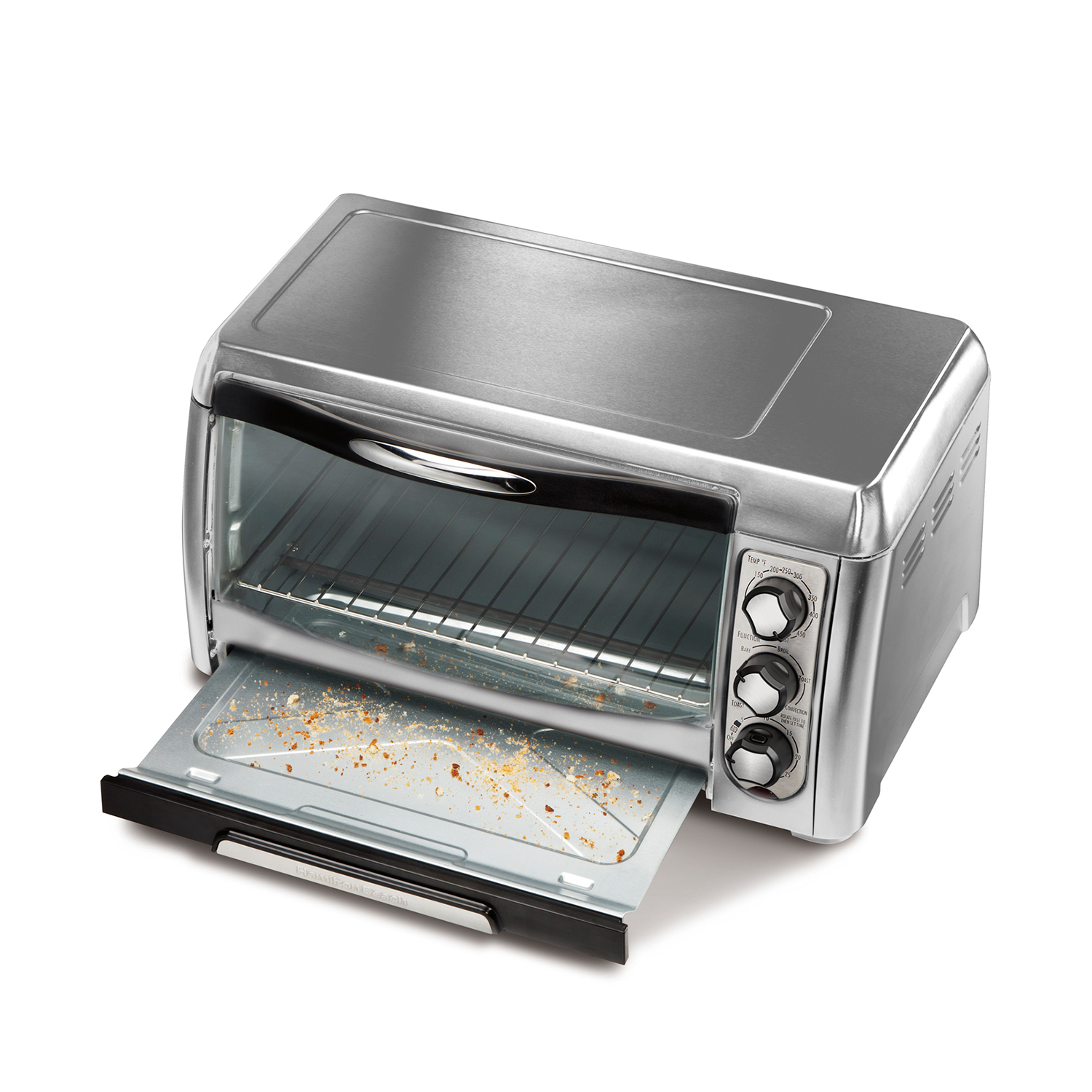 Incluye temporizador de 30 minutos, apagado automático con timbre indicador de listo, dos posiciones de parrilla, una bandeja para hornear, una parrilla para asar y una bandeja extraíble para migajas.