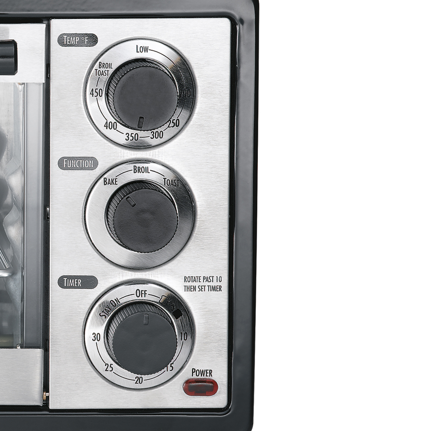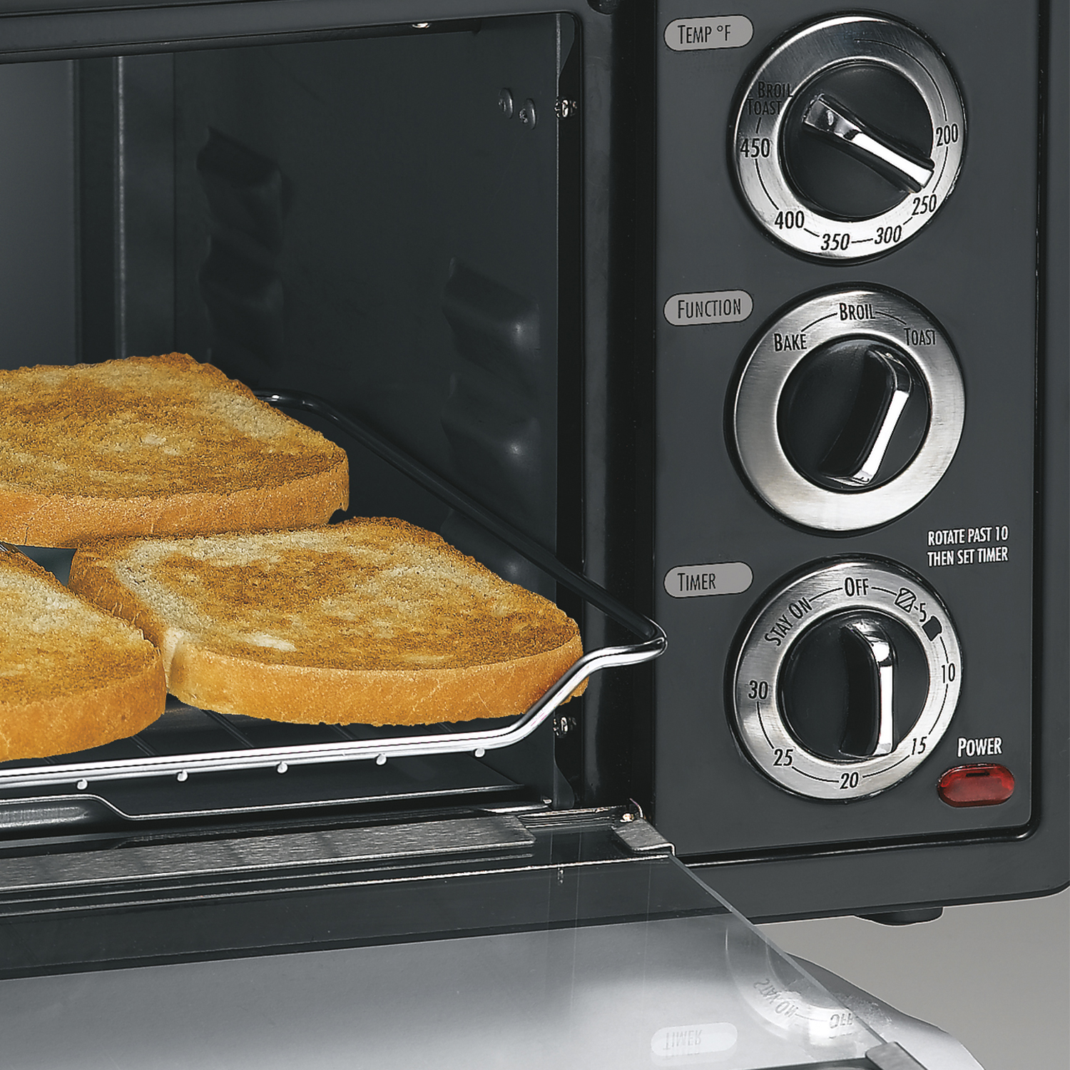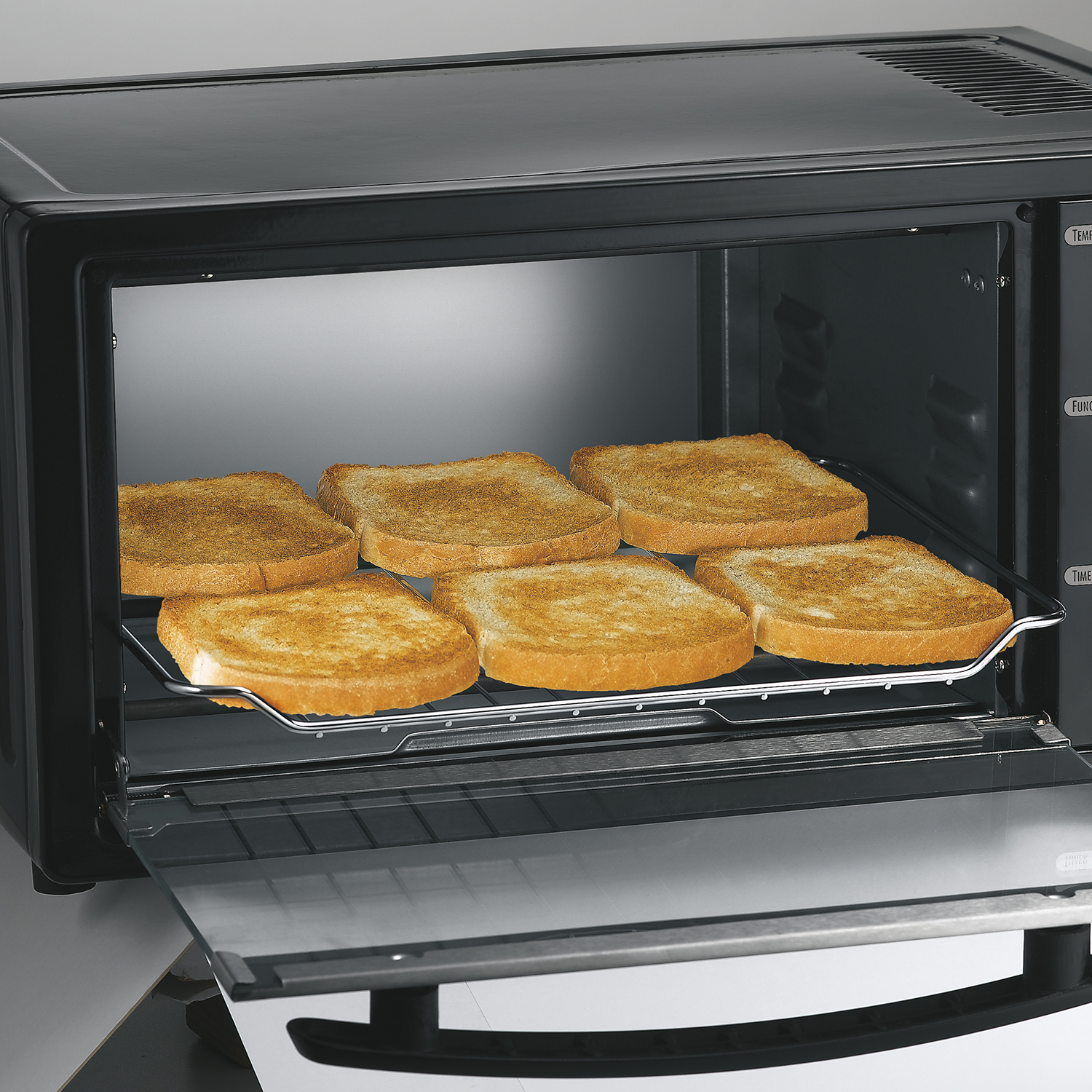 Incluye temporizador de 30 minutos, apagado automático con timbre indicador de listo, dos posiciones de parrilla, una bandeja para hornear, una parrilla para asar y una bandeja extraíble para migajas.