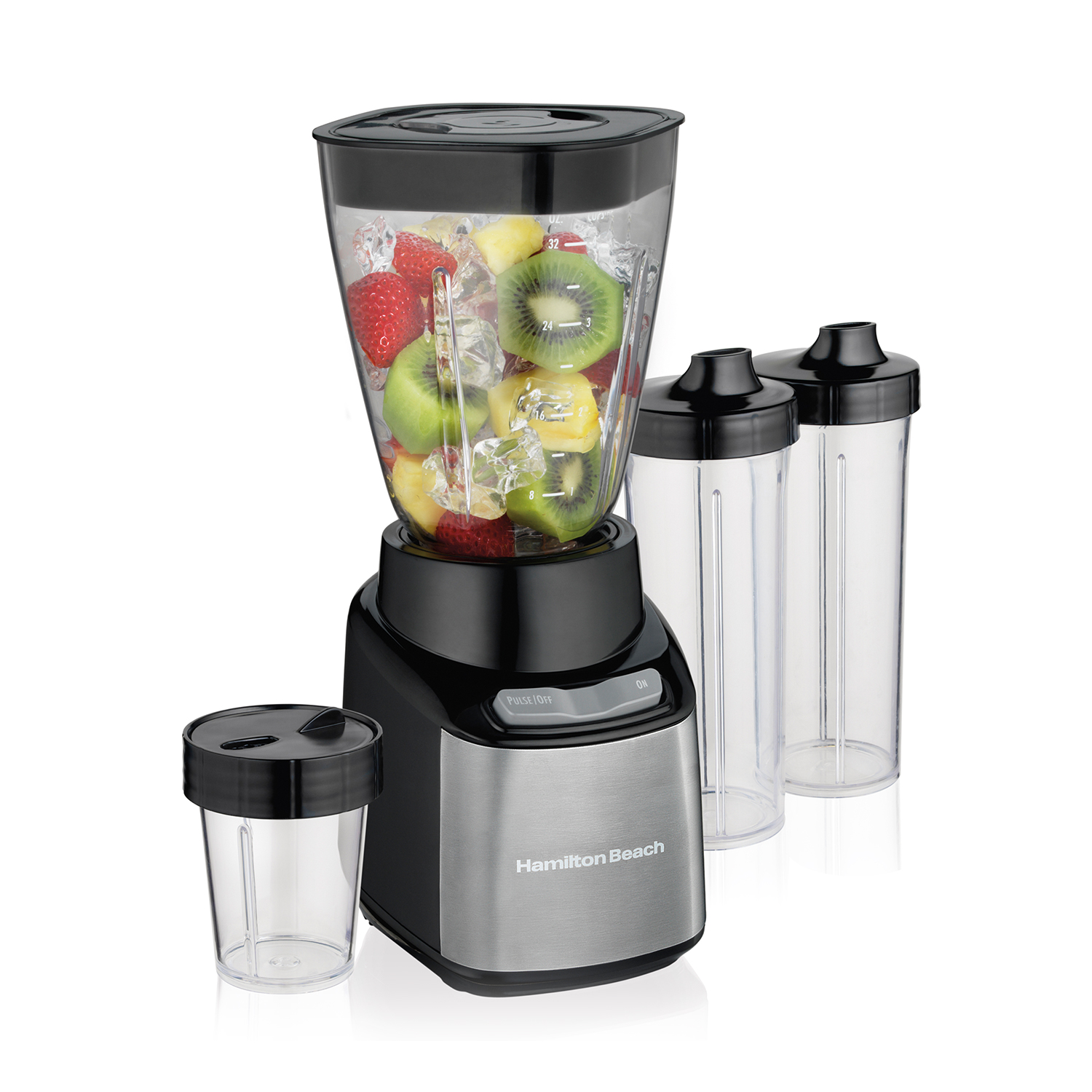 Incluye una jarra de 946 mililitros, 2 vasos para viaje de 473 mililitros y una taza para moler de 237 mililitros, todos libres de BPA. Todos los recipientes incluidos están hechos de Tritan® irrompible que es transparente y liviano, apto para lavavajillas.
