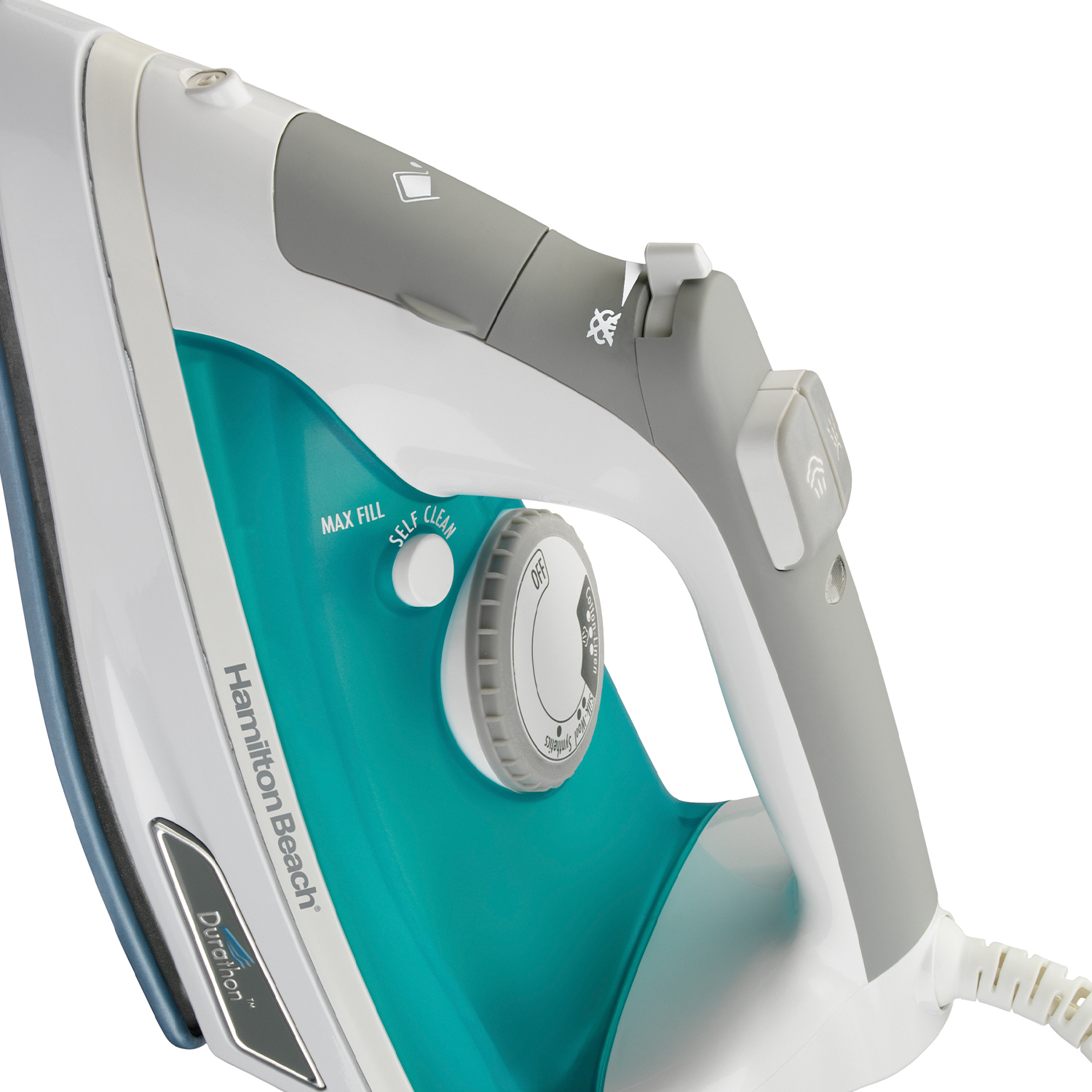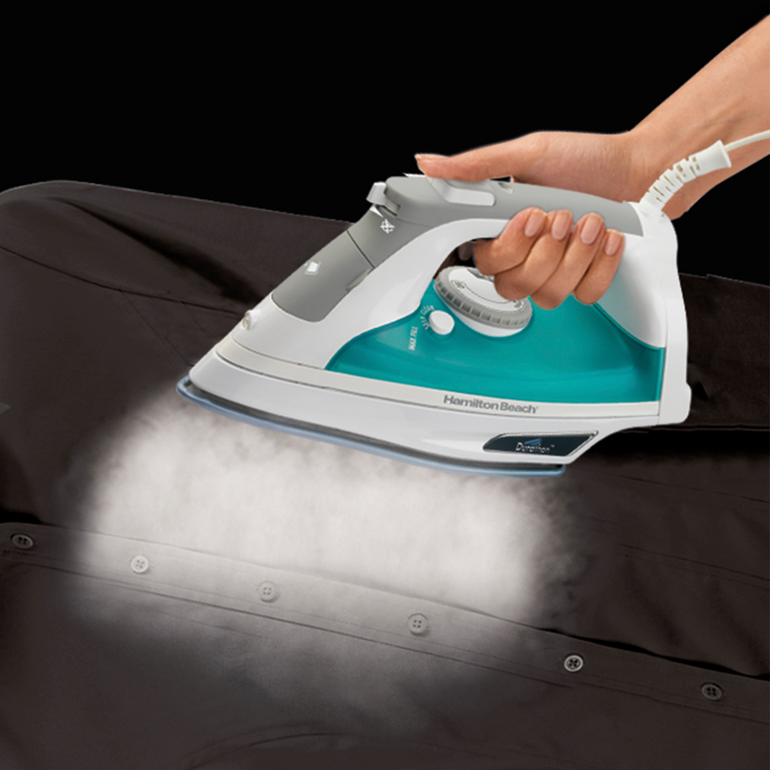 Elige el nivel de vapor y selecciona la tela adecuada en la perilla que te muestra los diferentes tipos de tela a planchar. Desaparece arrugas en pocos minutos con mínimo esfuerzo y mucho vapor. Siente el suave deslizamiento de la suela Durathon sobre tus prendas con la Plancha Durathon.