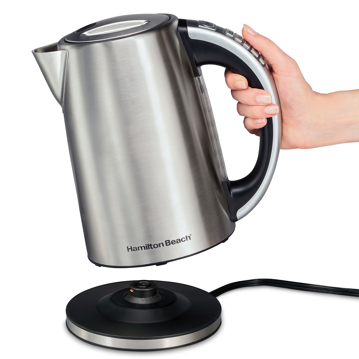 Calienta agua en instantes de la forma más fácil y segura con la Tetera con Temperaturas Preprogramadas Hamilton Beach. El agua para una taza estará hervida perfecta para un té o café soluble en menos de un minuto.
