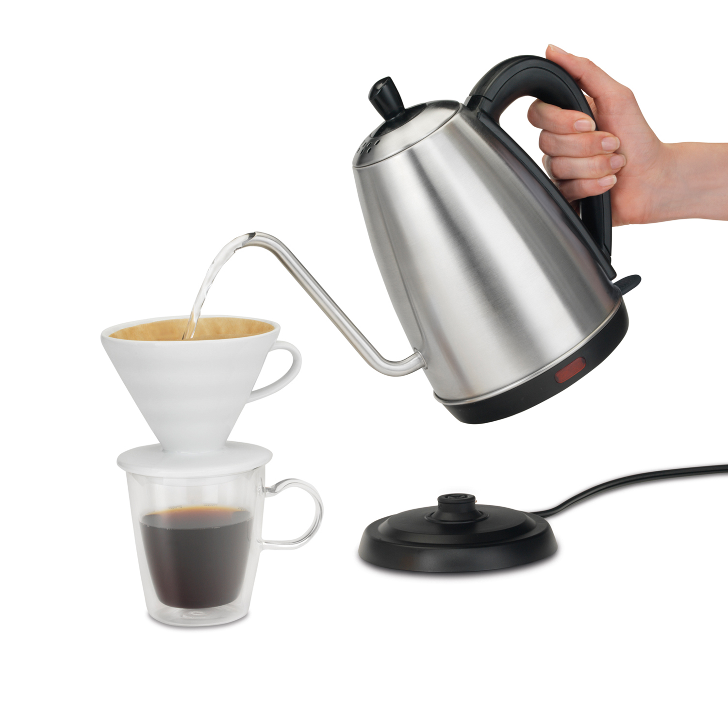 Una gran taza de café vertido comienza con la forma en que distribuye el agua hirviendo sobre él. El control preciso y un flujo lento y constante es definitivo para el resultado y lo puedes lograr fácilmente con la Tetera de cuello de cisne Hamilton Beach. Diseñado para café artesanal, esta tetera también es perfecta para té, chocolate caliente y más.