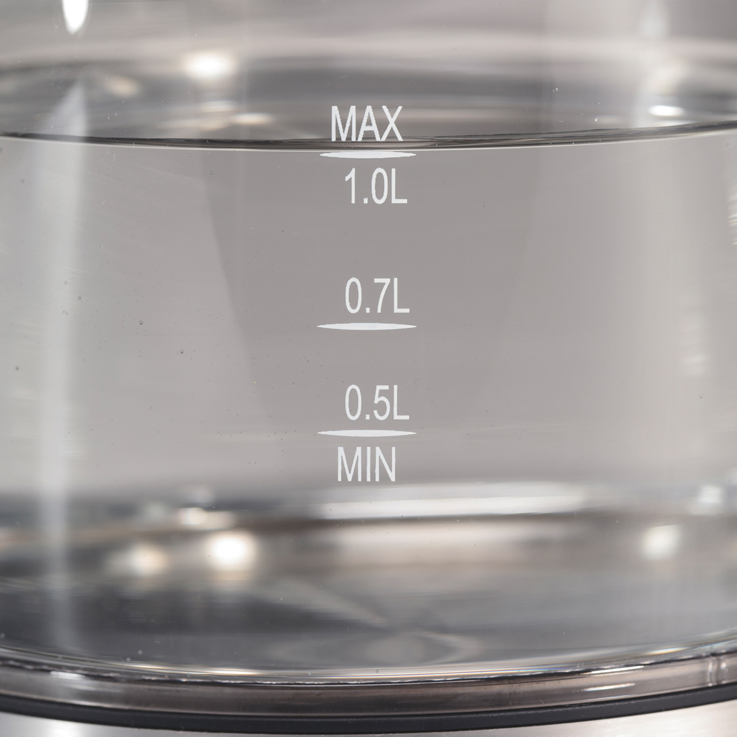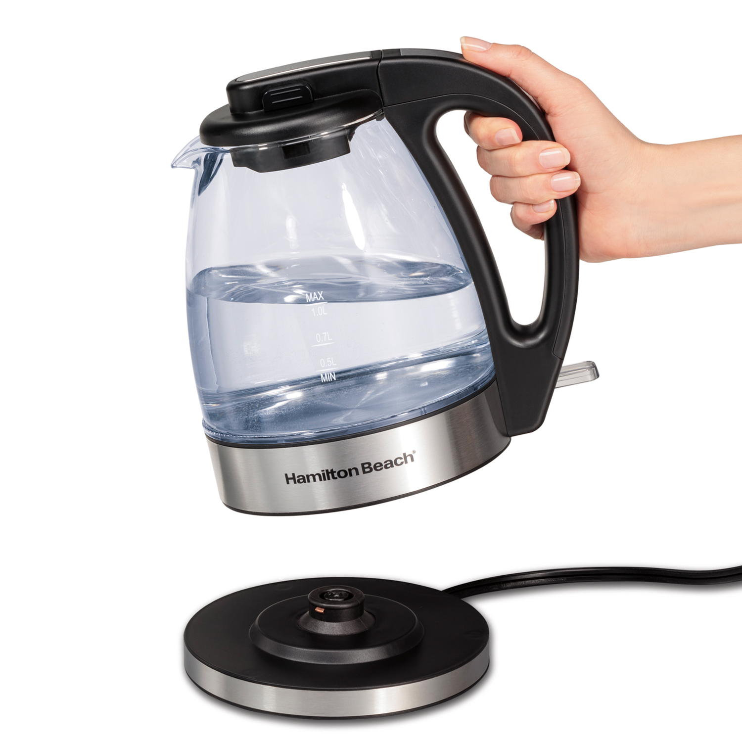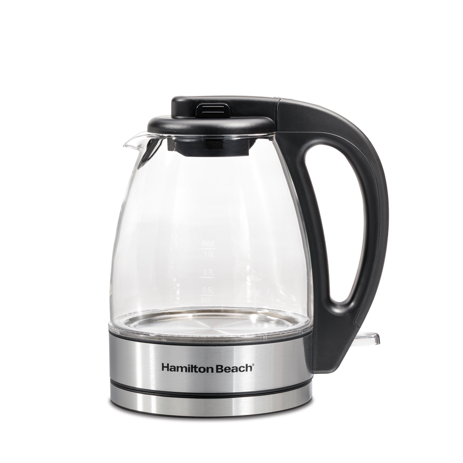 Calienta agua en instantes de la forma más fácil y segura con la Tetera de Vidrio de 1 Litro de Hamilton Beach.Relájate con la suave iluminación azul mientras el agua hierve para prepararte un té delicioso a cualquier hora del día.